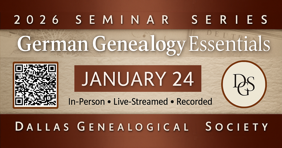 Join the Dallas Genealogical Society on January 24, 2026, at the Dallas Public Library for German Genealogy Essentials, a hands-on seminar that shows how to use U.S. records and German historical context to successfully trace your German ancestors.
