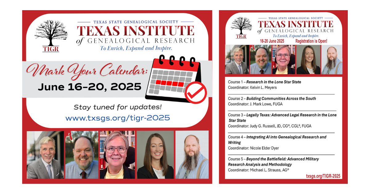 Registration for the Texas Institute of Genealogical Research (TIGR) is open. Held virtually this year, TIGR 2025 takes place June 16-20, 2025.