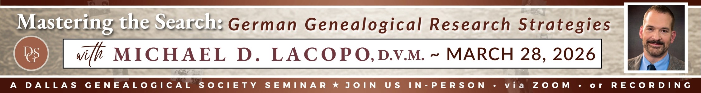 Refund Policy: Requests for refunds made prior to the early-bird cutoff date (March 8, 2026) will be granted (less a $10 handling fee). DGS will not issue refunds after 5:00 pm on March 8, but we will provide a syllabus (PDF) and access to the recorded lectures for two weeks after the presentation.